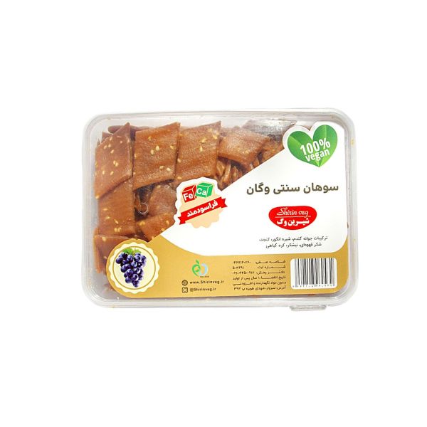 سوهان سنتی وگان ویگر، یک شیرینی سنتی و سالم ایرانی است که با ترکیبی از جوانه گندم، شیره انگور، کنجد، شکر قهوهای، نیشکر و کره گیاهی تهیه شده و تجربهای متفاوت از تنقلات سالم و مغذی را برای شما فراهم میکند. این محصول مناسب افرادی است که به دنبال شیرینی و میانوعده بدون مواد نگهدارنده و افزودنی شیمیایی هستند.