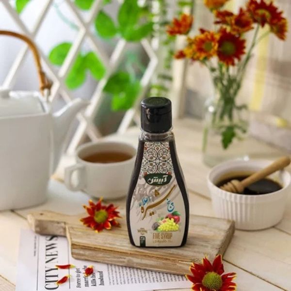پنج شیره آبیش ترکیبی از شیرههای توت، انجیر، انگور، خرما و سیب است که خواص بینظیر هر پنج شیره را با هم ترکیب کرده است. این معجون سرشار از مواد معدنی، آهن، منیزیم و منگنز بوده و برای سلامت عمومی بدن و تقویت انرژی فوقالعاده مفید است.