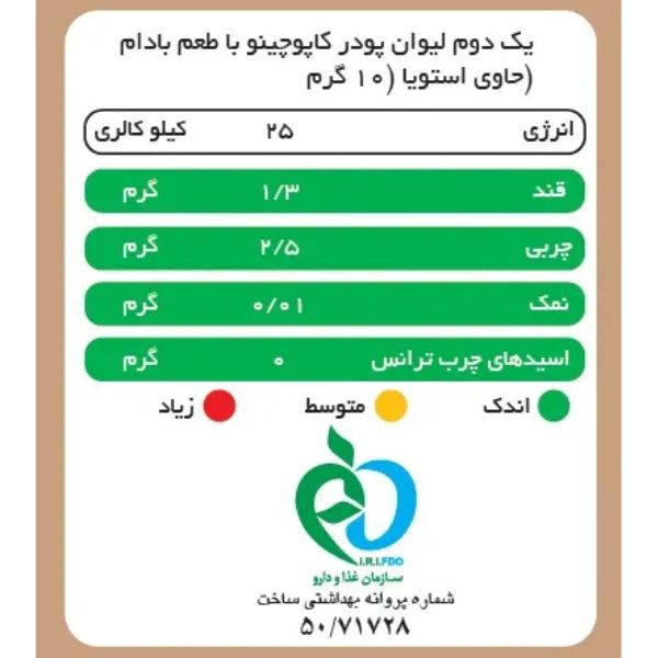 - حاوی 10 عدد ساشه کاپوچینو بادام بدون شکر