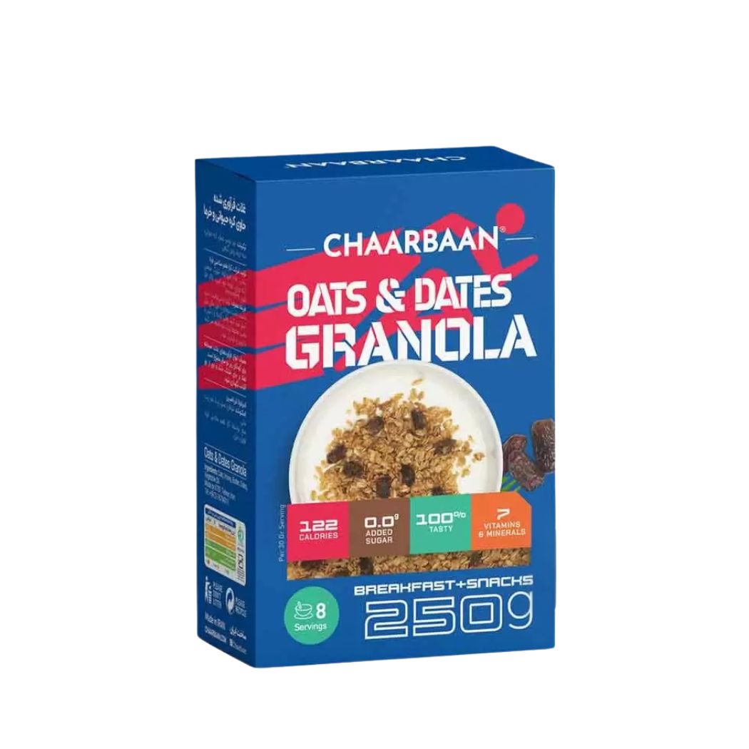 گرانولا جو دو سر و خرما با ۲ منبع کربوهیدرات با شاخص گلایسمی پایین، پروتئین و فیبر، انرژی پایدار، ریکاوری عضلات و تعادل قند خون را تأمین میکند.