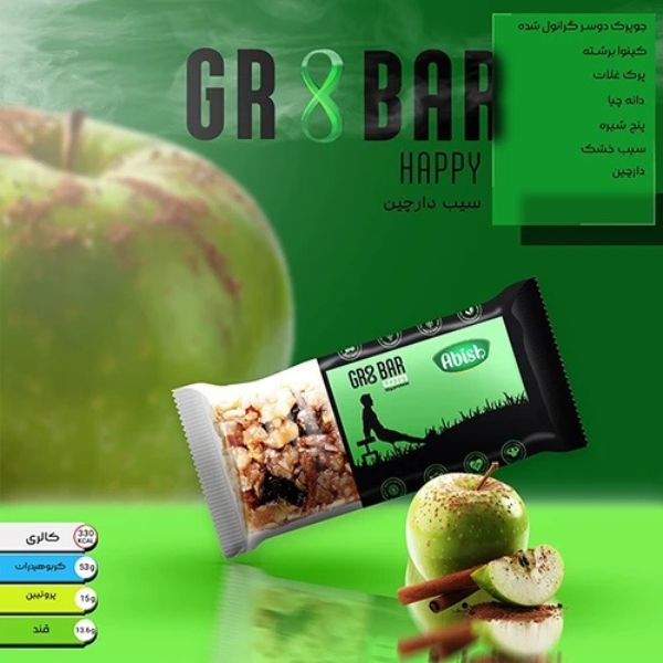 گریت بار هپی آبیش ترکیبی خوشمزه و مغذی از جو دوسر، کینوا برشته شده، پرک غلات، مغزیجات، دانه چیا، پنج شیره، آرد هفت جوانه، سیب خشک‌شده و دارچین است. این میان‌وعده سالم با رایحه دلنشین دارچین و طعم خاص سیب خشک، علاوه بر تأمین انرژی پایدار، به بهبود خلق‌وخو و کاهش استرس کمک می‌کند.